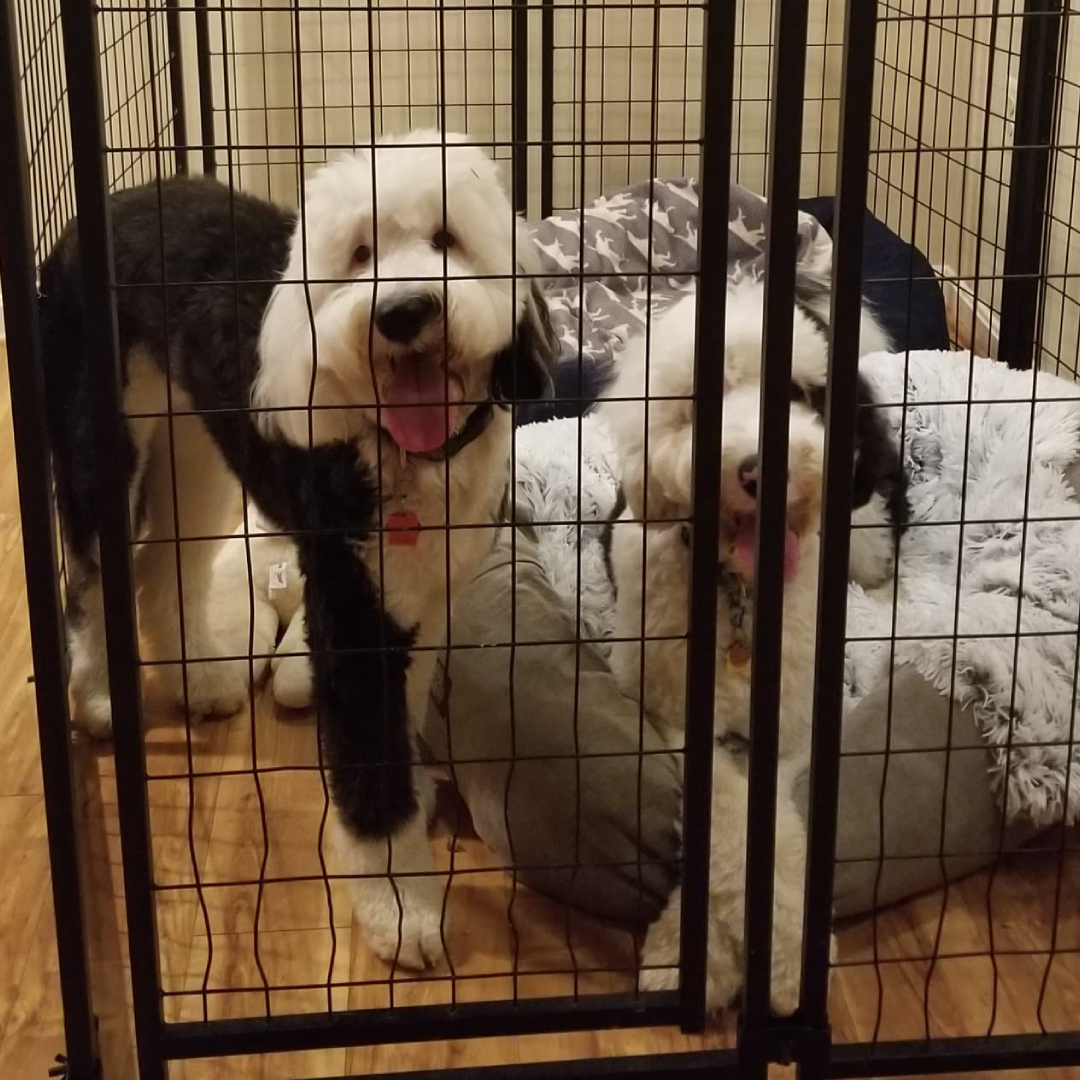We have a variety of sizes and types of crates, as well as multiple 5 ft by 5 ft freestanding kennels where dogs spend their downtime, including overnight.